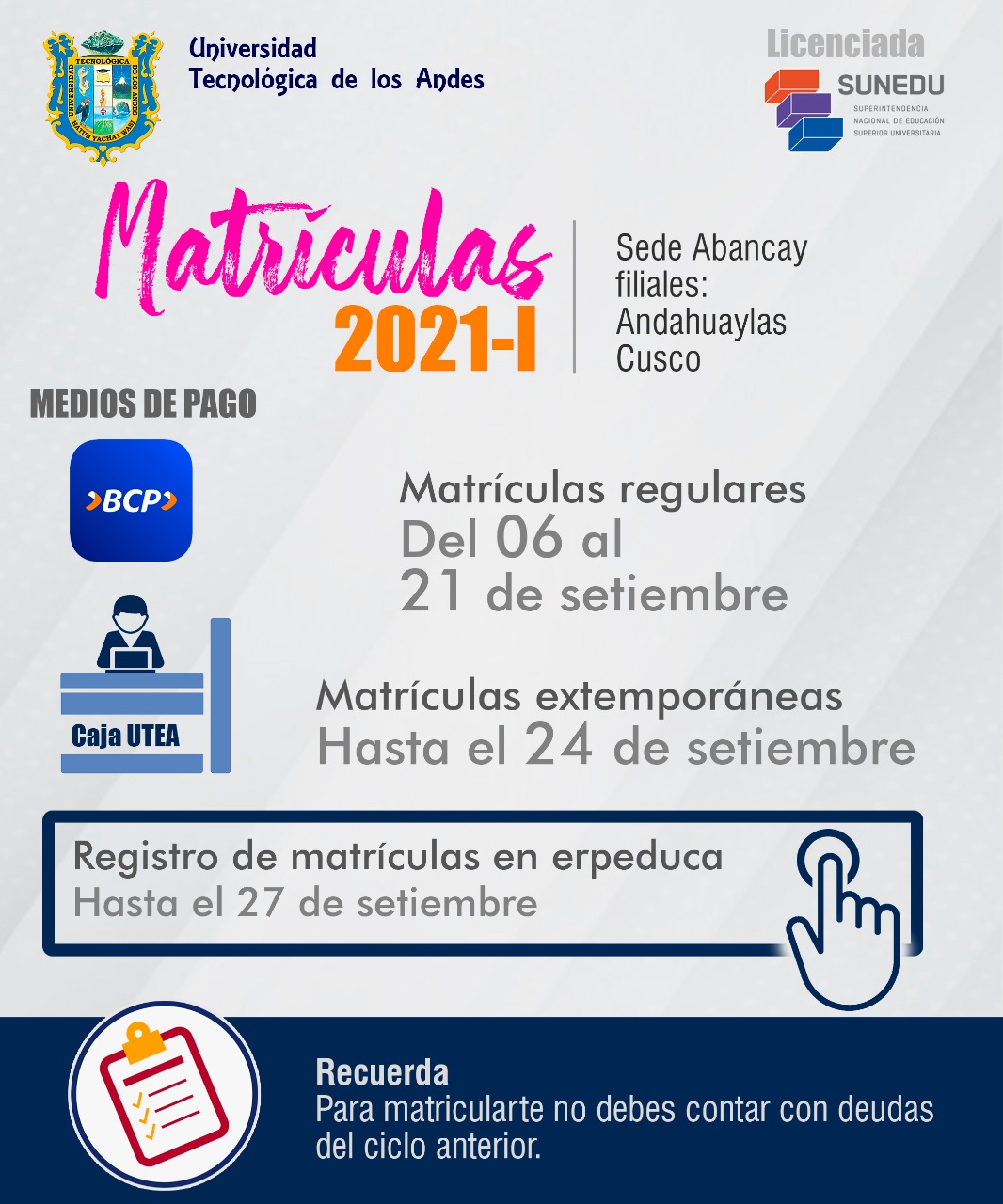Lista de Ingresantes de Pregrado UTEA 2021-1Comunicado Nro. 023-2021- Inscripción de Grados y Títulos en SUNEDU