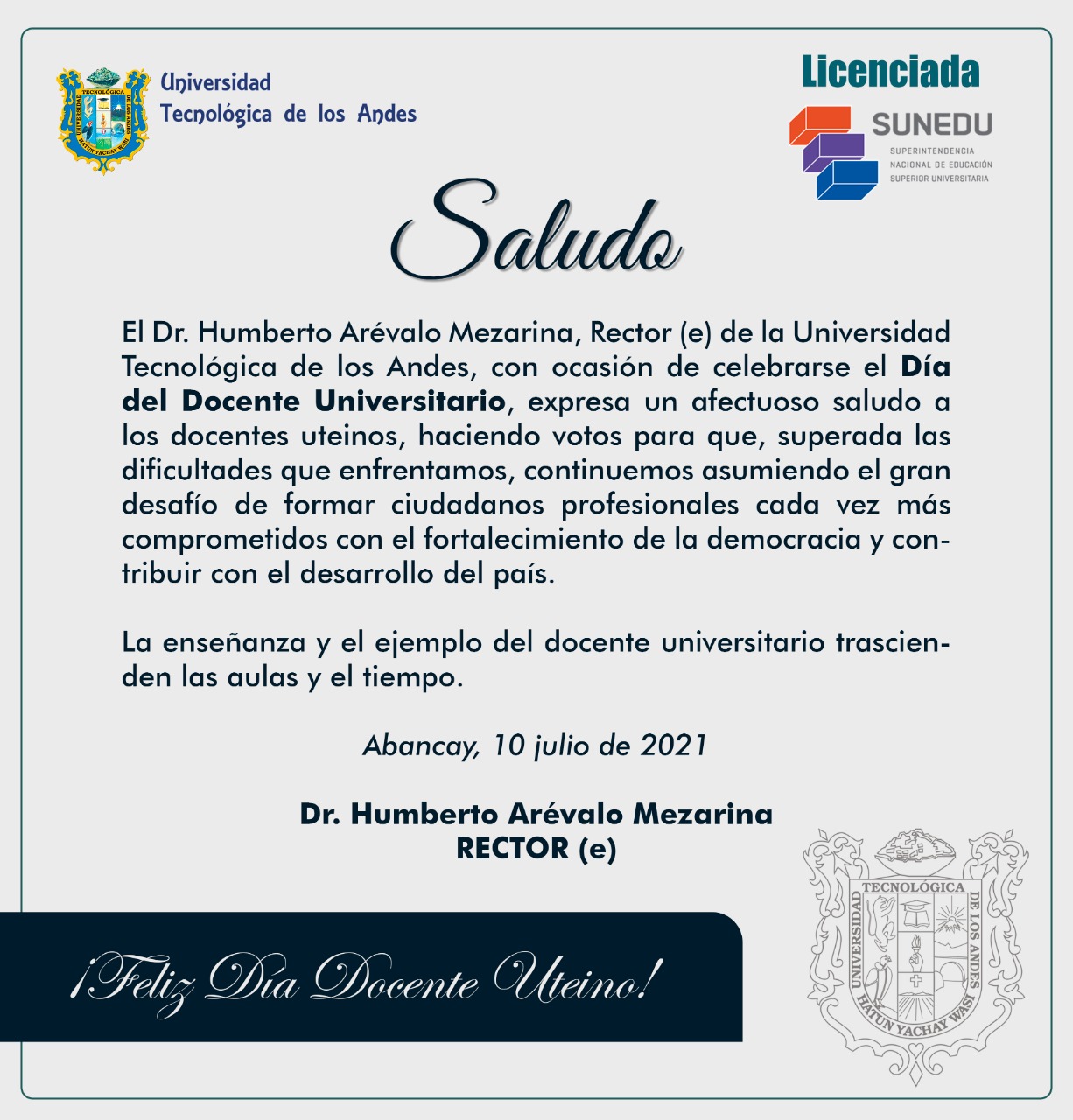 Rector de la UTEA saluda a Docentes UniversitariosComunicado 009-2021 – Entrega de diplomas de Grado Académico de Bach...